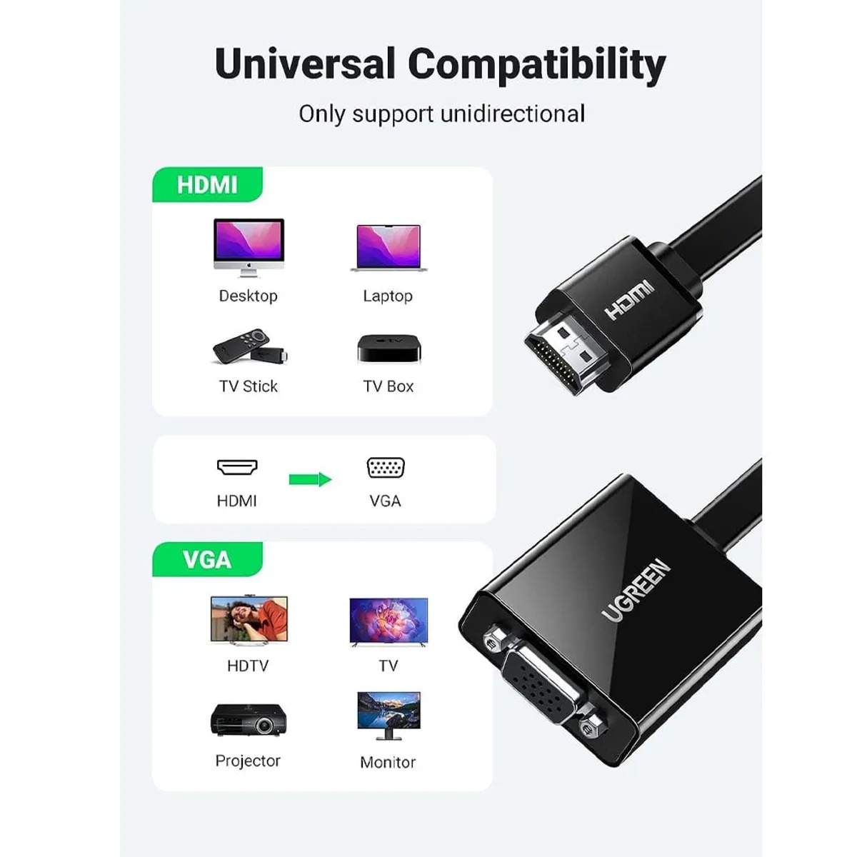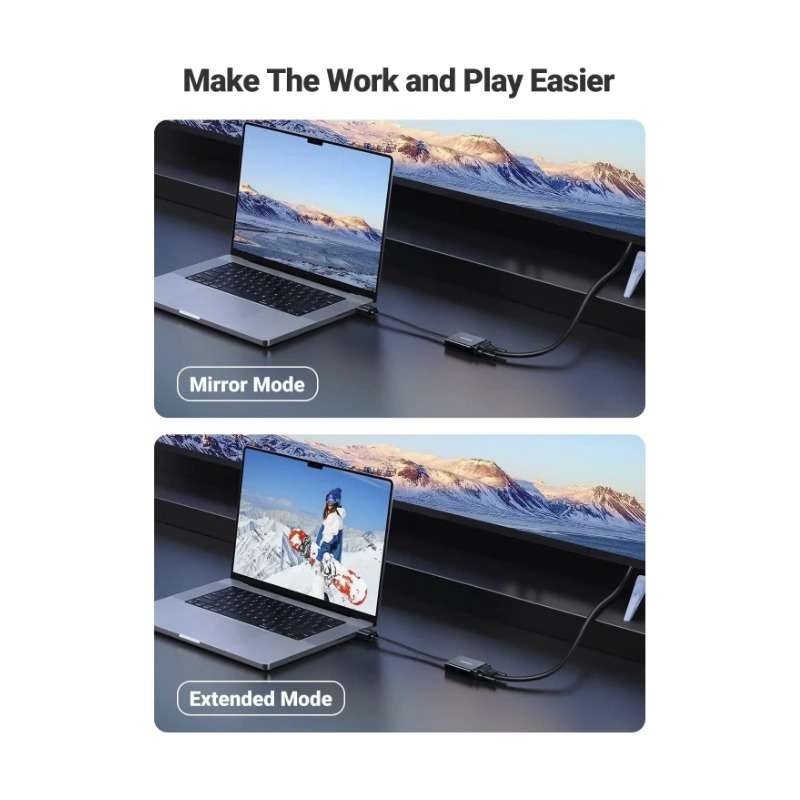 El adaptador HDMI a VGA UGREEN ofrece una forma sencilla y fiable de conectar dispositivos HDMI a pantallas VGA. Tanto si necesita conectar su portátil a un proyector como a un monitor, este adaptador garantiza una transición fluida y nítida.