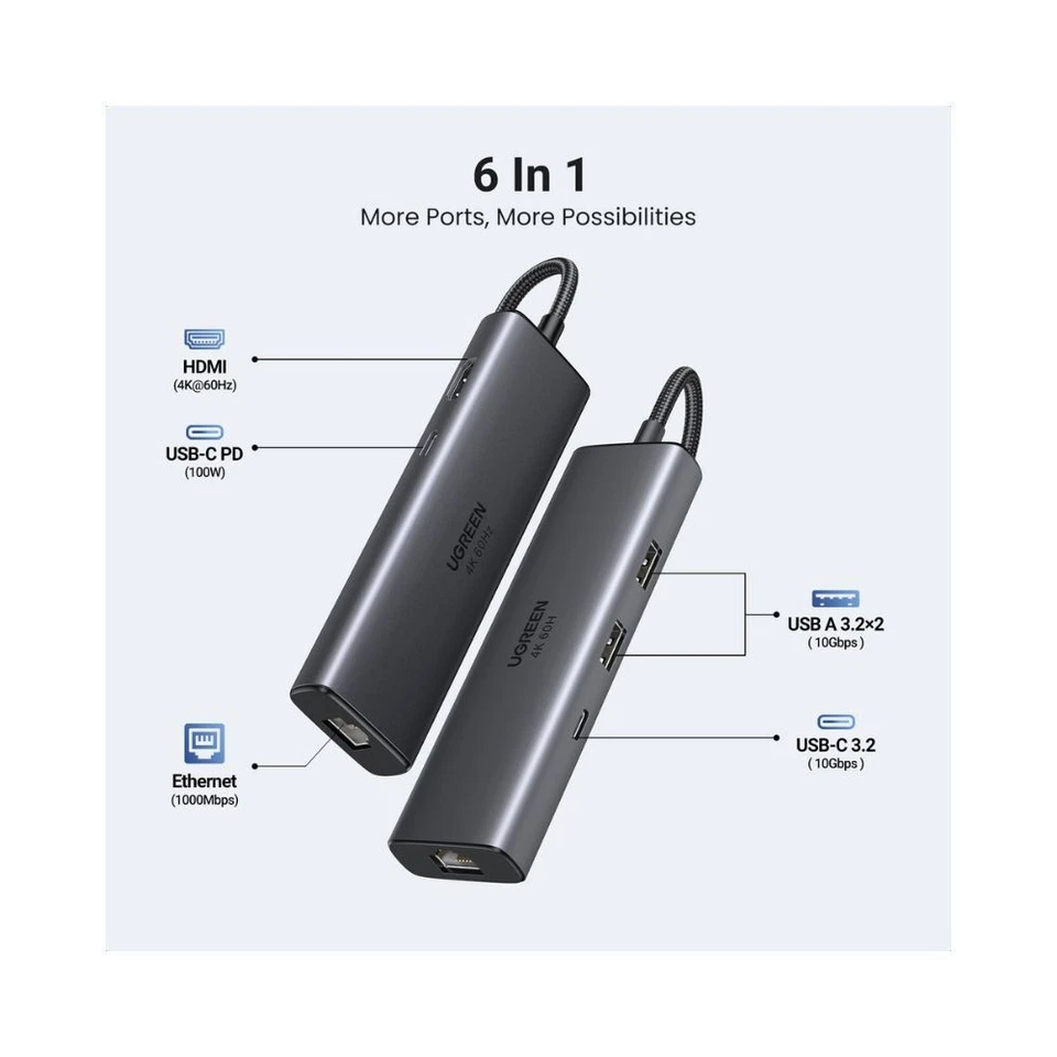 ADAPTADOR HUB USB-C UGREEN 6 EN 1/1X USB-C 3.2/2X USB-A 3.2/ 1X HDMI/1X RJ45/1X PD 100W MOD.45000