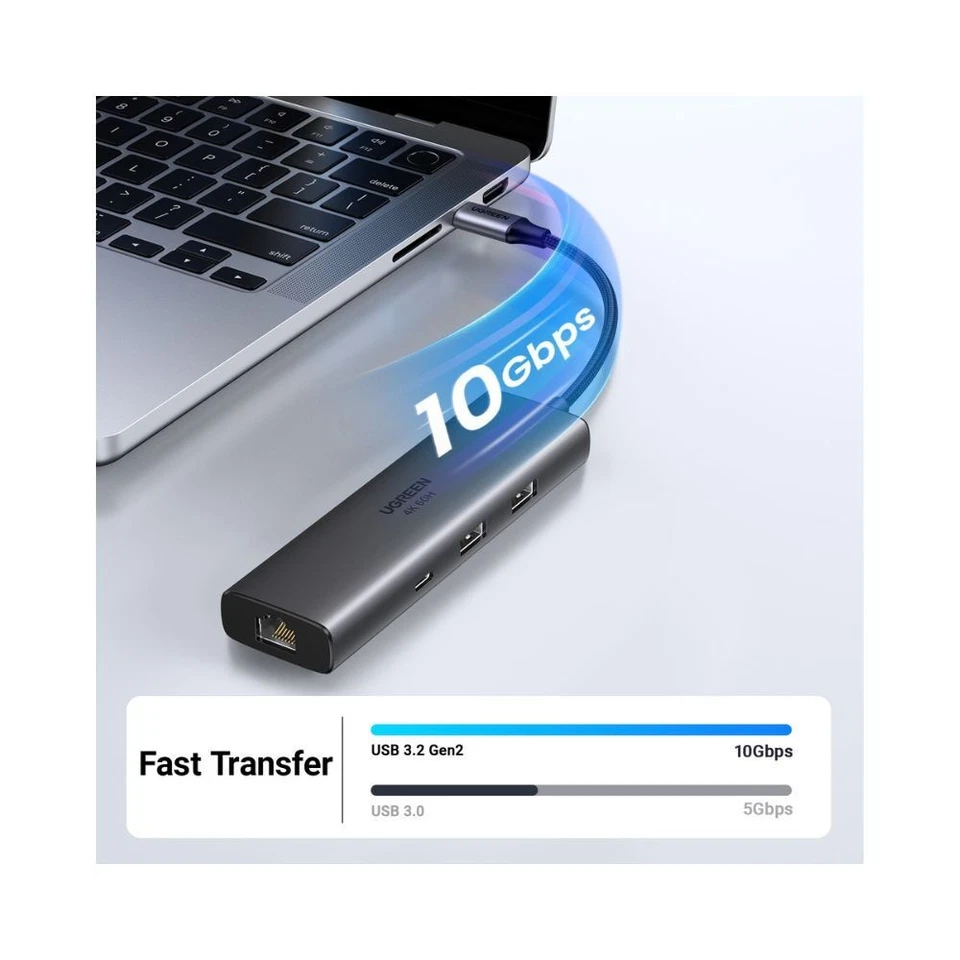 La capacidad del UGREEN CM512 de soportar hasta dos pantallas 4K simultáneamente a través de su puerto HDMI te permite trabajar o disfrutar de contenido multimedia con una claridad asombrosa. No importa si estás presentando tu proyecto más reciente o viendo una película en ultra alta definición, el adaptador UGREEN asegura que la calidad de imagen sea impecable. Además, su puerto RJ-45 te garantiza una conexión a internet estable y rápida, ideal para videoconferencias o trabajos en línea donde la velocidad y fiabilidad son esenciales. Con UGREEN, siempre tendrás un acceso rápido a una red de alta calidad.